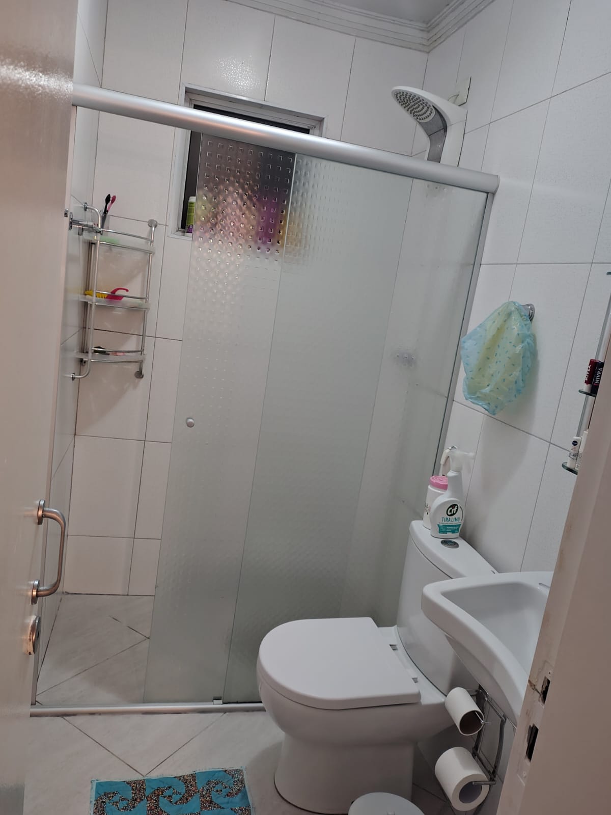 Banheiro com box de vidro.